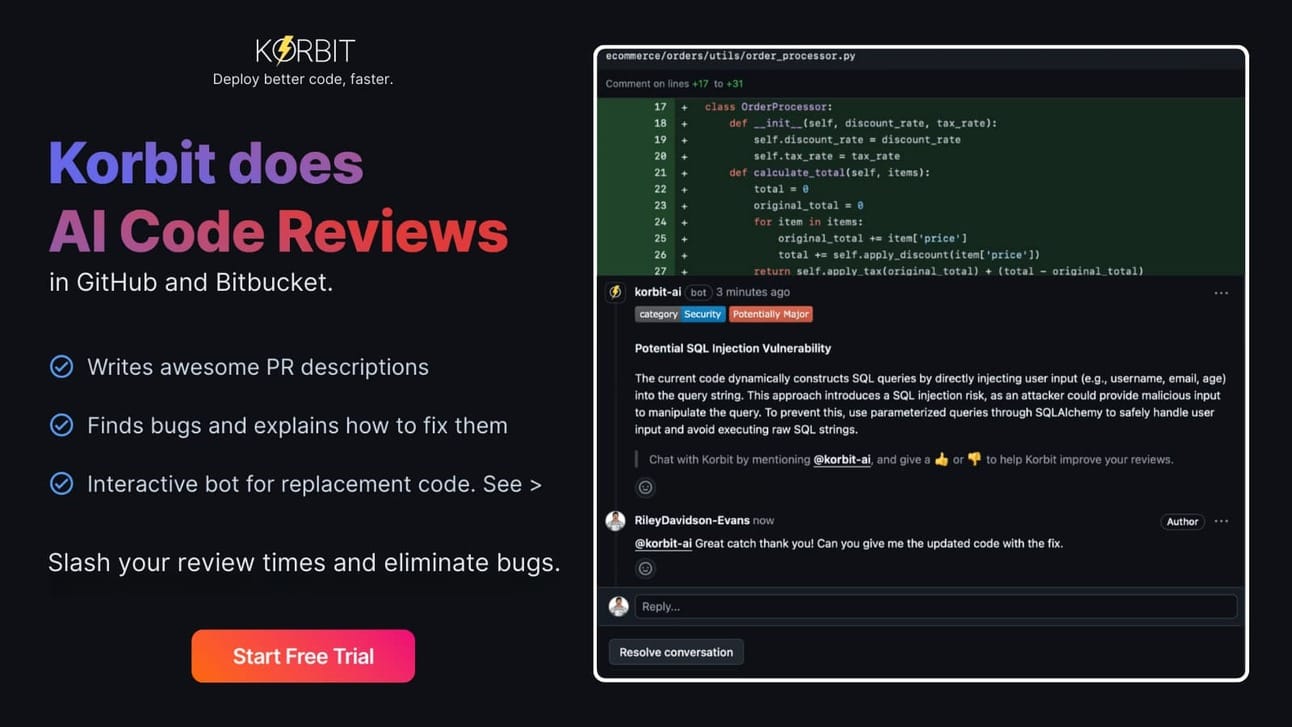 Korbit is an AI-Powered Code Reviewer that helps you write better code, faster. It doesn't just detect bugs—it explains how to fix them, writes an awesome PR description, release notes, developer insights, and more.