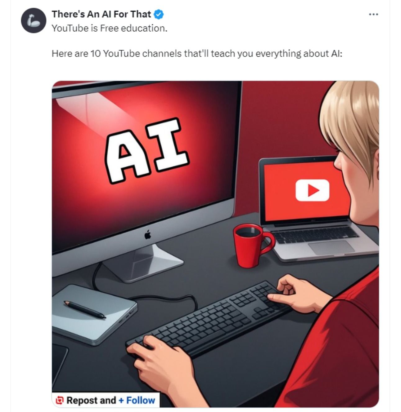 If you don’t have an account on X, you can still view this thread here: https://taaft.notion.site/Learn-AI-from-YouTube-925dddf3da8e4aaabbf49ae1b8fc0b35