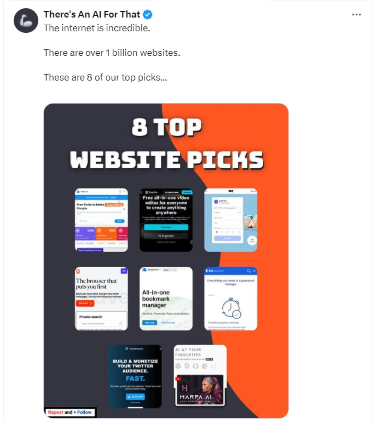 If you don’t have an account on X, you can still view this thread here: https://taaft.notion.site/8-Top-Website-Picks-b22bddbf95b543488c64114913f2f413
