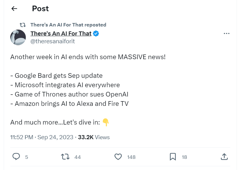 Hold on to your hats, folks! This week in AI is packed with some real jaw-droppers. Google Bard just got a September makeover, and Microsoft is sprinkling AI magic everywhere. Did you hear the buzz? The Game of Thrones author is suing OpenAI! And guess what? Amazon’s not falling behind, they're bringing AI to Alexa and Fire TV. Let’s get the lowdown on all this exciting stuff! 🌟