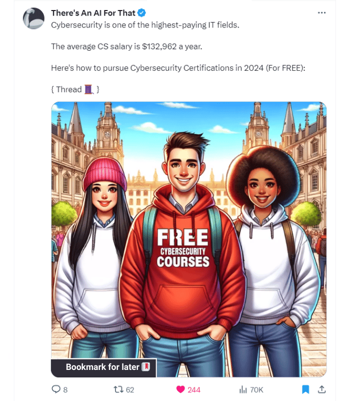 If you don’t have an account on X, you can still view this thread here: https://taaft.notion.site/Cybersecurity-Certifications-to-pursue-in-2024-80387a95cdde4cd496057a86a9007b98