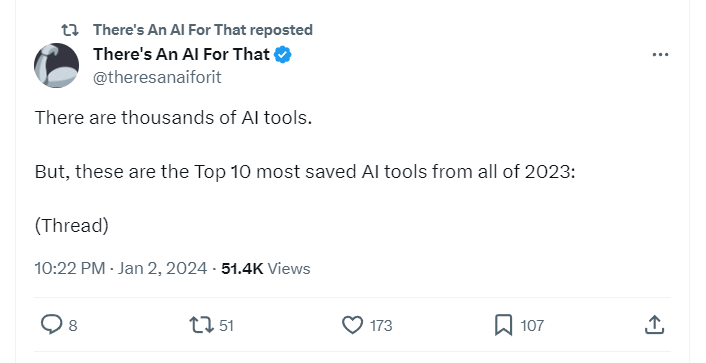 If you don’t have an account on X, you can still view this thread here: https://nitter.net/theresanaiforit/status/1742189509507190889