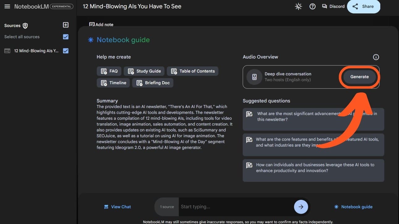 Lastly, look for the ‘Audio Overview’ section with the ‘Generate’ button as you can see in the image above.