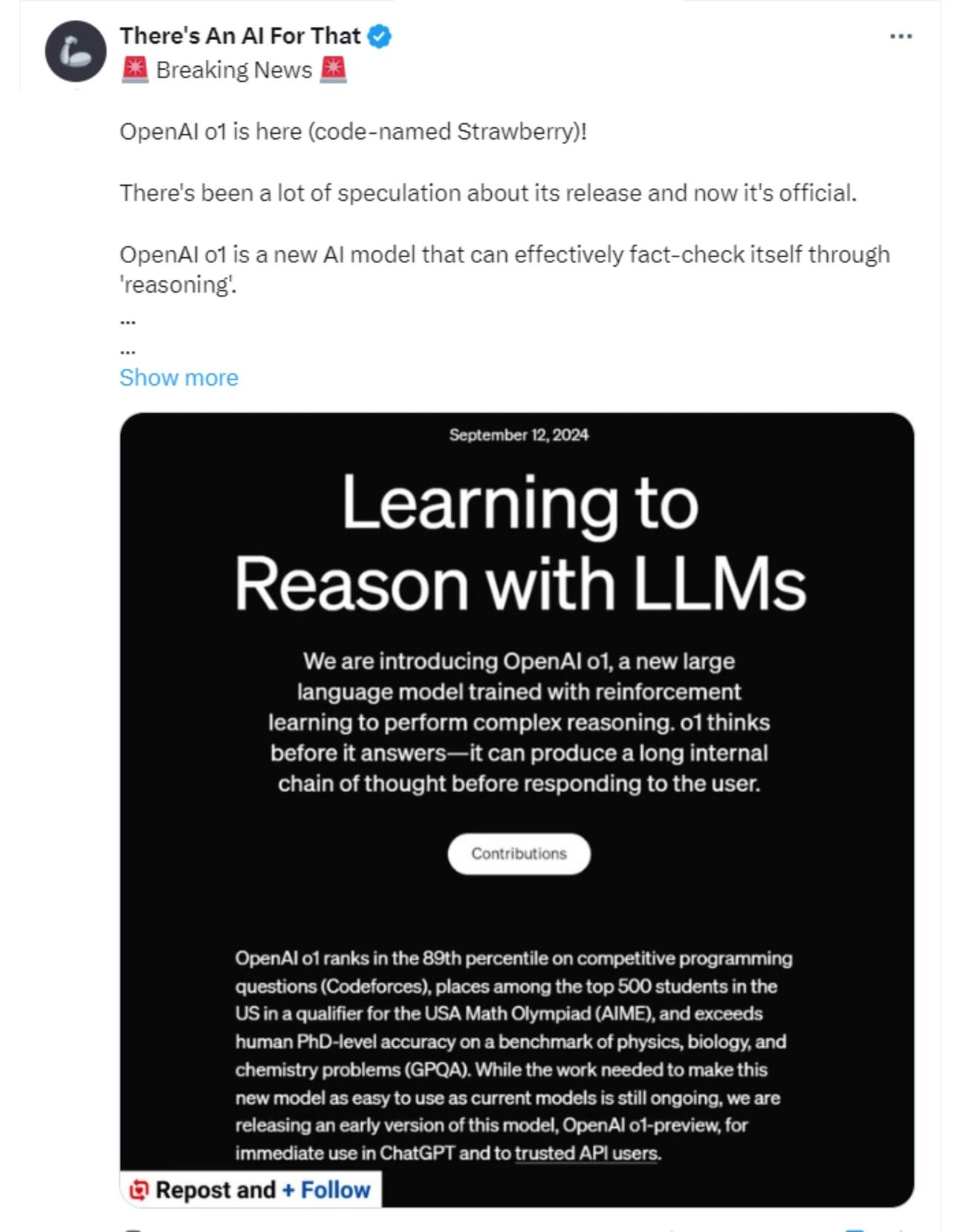 In this thread, we'll explore the key features of OpenAI o1, including its groundbreaking ability to fact-check itself through 'reasoning'. This development represents a significant step forward in creating more reliable and trustworthy AI systems. 🍓🤖