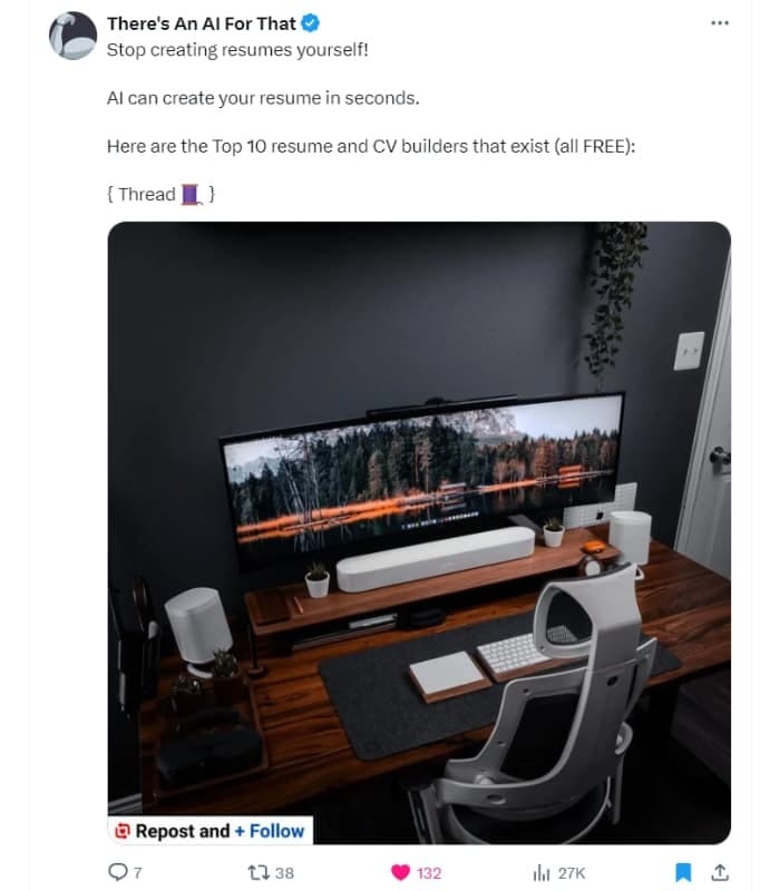 If you don’t have an account on X, you can still view this thread here: https://taaft.notion.site/Top-10-AI-resume-and-CV-builders-1a3e964df9ab49458b868d915dc8bfbb