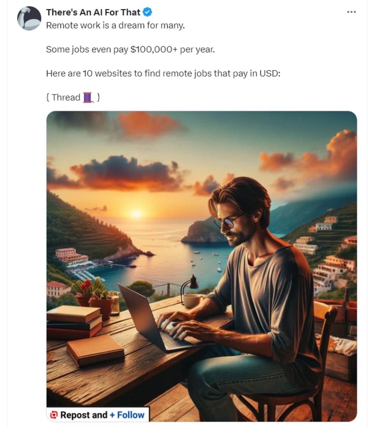 If you don’t have an account on X, you can still view this thread here: https://taaft.notion.site/10-websites-to-find-remote-work-7e1c83800e604329a7cb0045689e0148